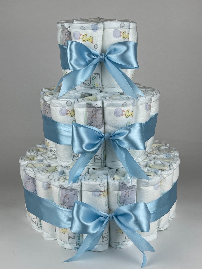 Luiertaart Basic 64 Blauw. Een mooie basic luiertaart opgebouwd met drie lagen luiers maat 2 van het merk Pampers, met eromheen mooie blauw gekleurde linten.