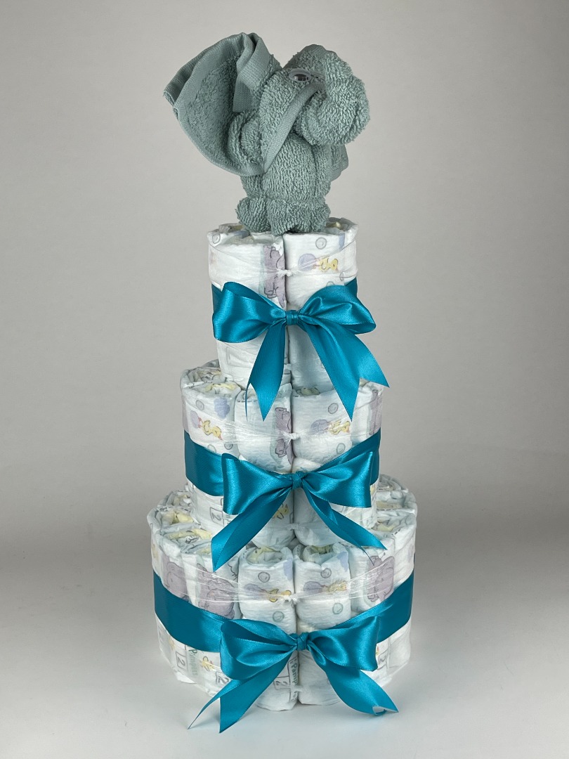 Luiertaart Olifant Stone groen - Petrol. Een mooie luiertaart opgebouwd met drie lagen luiers maat 2 van het merk Pampers, met eromheen mooie neutrale petrol groen / blauw gekleurde linten en ter aankleding van de luiertaart staat bovenop de taart een olifant gevouwen van twee stone groen gekleurde monddoekjes | spuugdoekjes.