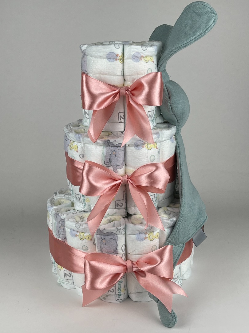 Luiertaart Konijn Snoes Stone groen - donker Poeder Roze. Een mooie luiertaart opgebouwd met drie lagen luiers maat 2 van het merk Pampers, met eromheen mooie donker poeder roze gekleurde linten en ter aankleding van de luiertaart een schattig stone groen gekleurd knuffeldoekje met labeltjes in de vorm van een konijn genaamd Snoes.