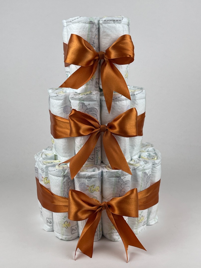 Luiertaart Basic 40 Koper. Een mooie basic luiertaart opgebouwd met drie lagen luiers maat 2 van het merk Pampers, met eromheen mooie neutrale koper / roest gekleurde linten.