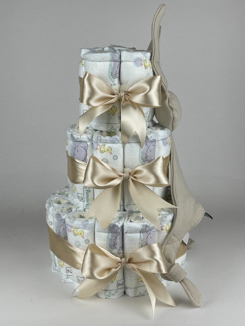 Luiertaart Konijn Snoes Cream - Beige. Een mooie luiertaart opgebouwd met drie lagen luiers maat 2 van het merk Pampers, met eromheen mooie neutrale beige gekleurde linten en ter aankleding van de luiertaart een schattig cream beige gekleurd knuffeldoekje met labeltjes in de vorm van een konijn genaamd Snoes.