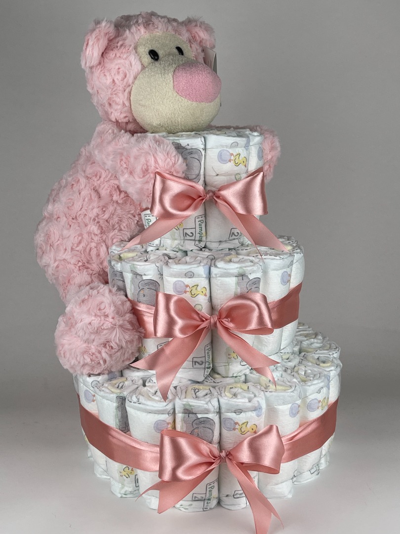 Luiertaart Beer Felix Roze - donker Poeder Roze. Een mooie luiertaart opgebouwd met drie lagen luiers maat 2 van het merk Pampers met eromheen mooie donker poeder roze gekleurde linten en ter aankleding van de luiertaart een mooie roze gekleurde knuffel beer Felix.