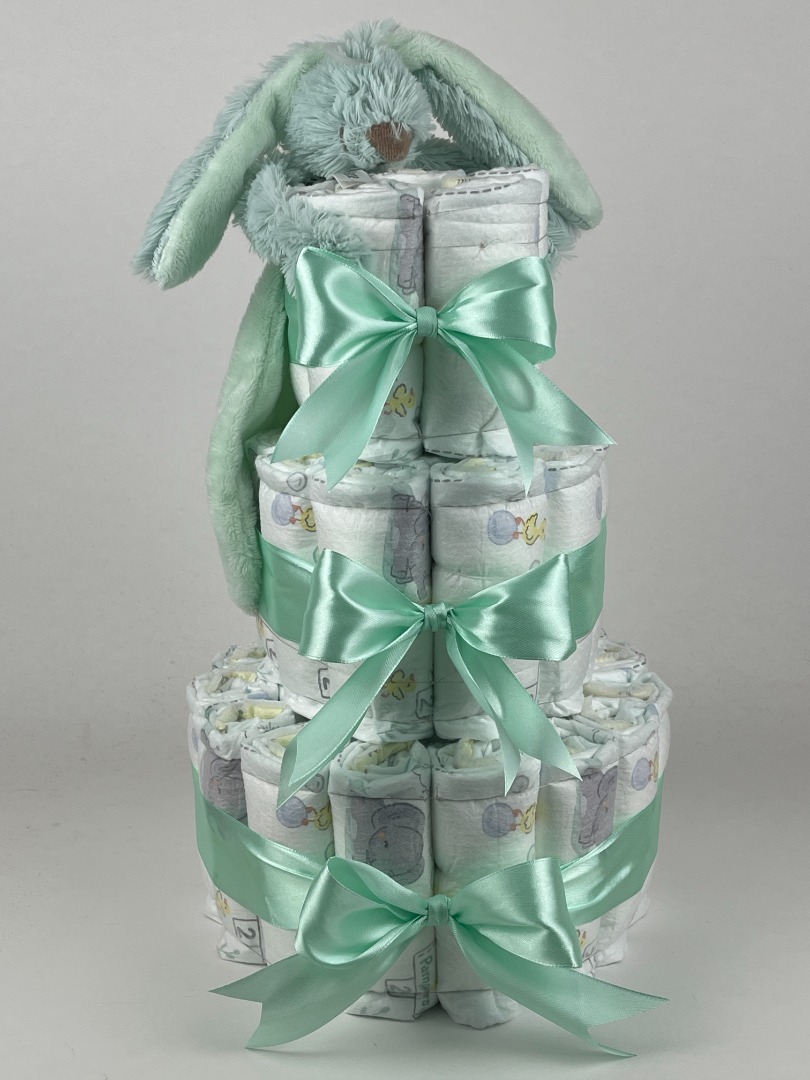 Luiertaart Happy Horse Tuttle Konijn Richie Lagoon - Groen. Een mooie luiertaart opgebouwd met drie lagen luiers maat 2 van het merk Pampers, met eromheen mooie neutrale groen gekleurde linten en ter aankleding van de luiertaart een heerlijk zacht lagoon groen gekleurd Rabbit Richie knuffeldoekje van het merk Happy Horse.