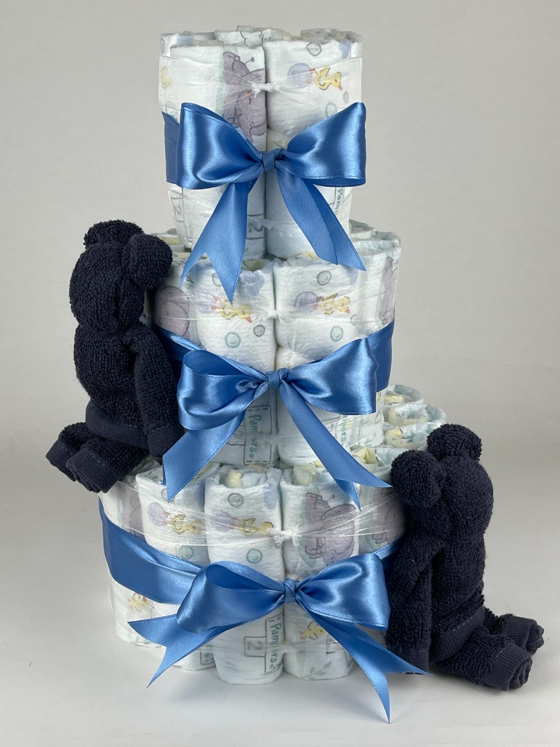 Luiertaart Beren Navy donker Blauw - diep Blauw. Een mooie luiertaart opgebouwd met drie lagen luiers maat 2 van het merk Pampers, met eromheen mooie diep blauw gekleurde linten en ter aankleding van de luiertaart twee navy donker blauw gekleurde monddoekjes | spuugdoekjes gevouwen als beren.