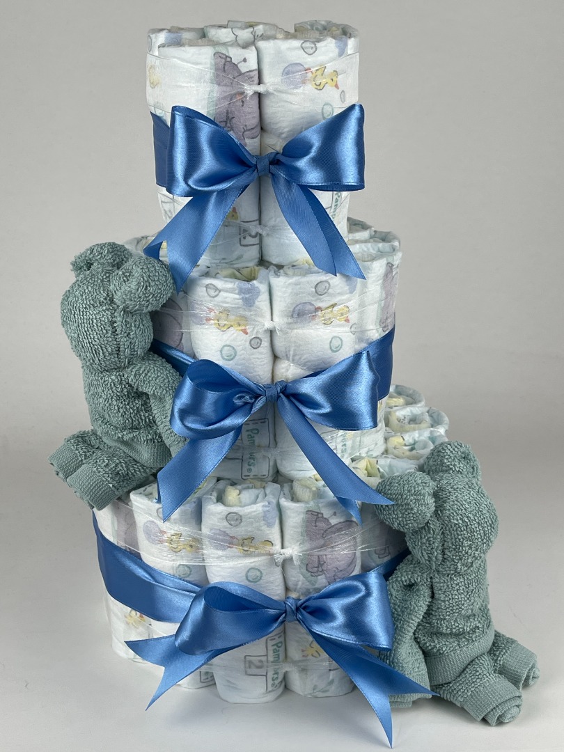 Luiertaart Beren Stone groen - diep Blauw. Een mooie luiertaart opgebouwd met drie lagen luiers maat 2 van het merk Pampers, met eromheen mooie diep blauw gekleurde linten en ter aankleding van de luiertaart twee stone groen gekleurde monddoekjes | spuugdoekjes gevouwen als beren.