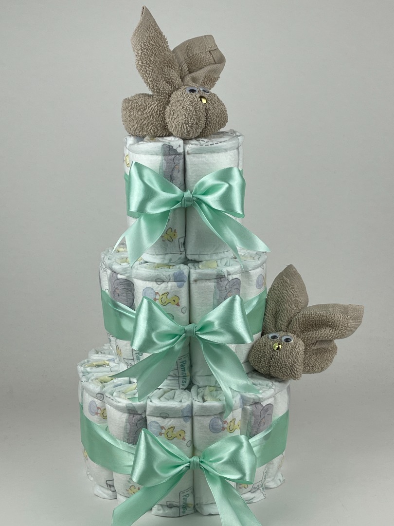 Luiertaart Konijnen Cream - Groen. Een mooie luiertaart opgebouwd met drie lagen luiers maat 2 van het merk Pampers, met eromheen mooie neutrale groen gekleurde linten en ter aankleding van de luiertaart twee cream beige gekleurde monddoekjes | spuugdoekjes gevouwen als konijnen.
