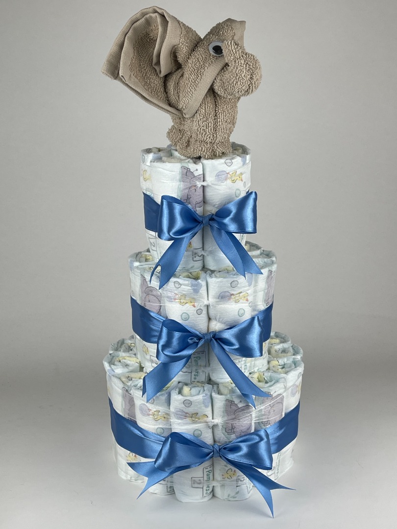 Luiertaart Olifant Cream - diep Blauw. Een mooie luiertaart opgebouwd met drie lagen luiers maat 2 van het merk Pampers, met eromheen mooie diep blauw gekleurde linten en ter aankleding van de luiertaart staat bovenop de taart een olifant gevouwen van twee cream beige gekleurde monddoekjes | spuugdoekjes.