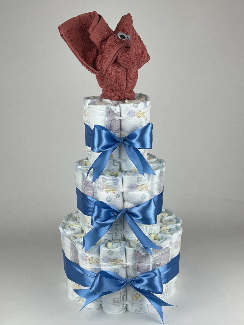 Luiertaart Olifant Koper - diep Blauw. Een mooie luiertaart opgebouwd met drie lagen luiers maat 2 van het merk Pampers, met eromheen mooie diep blauw gekleurde linten en ter aankleding van de luiertaart staat bovenop de taart een olifant gevouwen van twee koper gekleurde monddoekjes | spuugdoekjes.