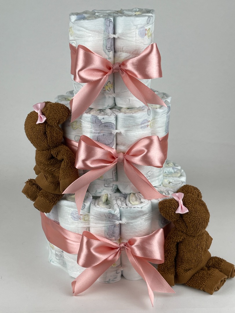 Luiertaart Beren clay Bruin - donker Poeder Roze. Een mooie luiertaart opgebouwd met drie lagen luiers maat 2 van het merk Pampers, met eromheen mooie donker poeder roze gekleurde linten en ter aankleding van de luiertaart twee clay bruin gekleurde monddoekjes | spuugdoekjes gevouwen als beren.