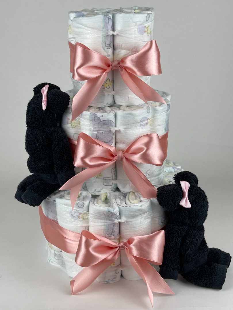 Luiertaart Beren Zwart - donker Poeder Roze. Een mooie luiertaart opgebouwd met drie lagen luiers maat 2 van het merk Pampers, met eromheen mooie donker poeder roze gekleurde linten en ter aankleding van de luiertaart twee zwart gekleurde monddoekjes | spuugdoekjes gevouwen als beren.