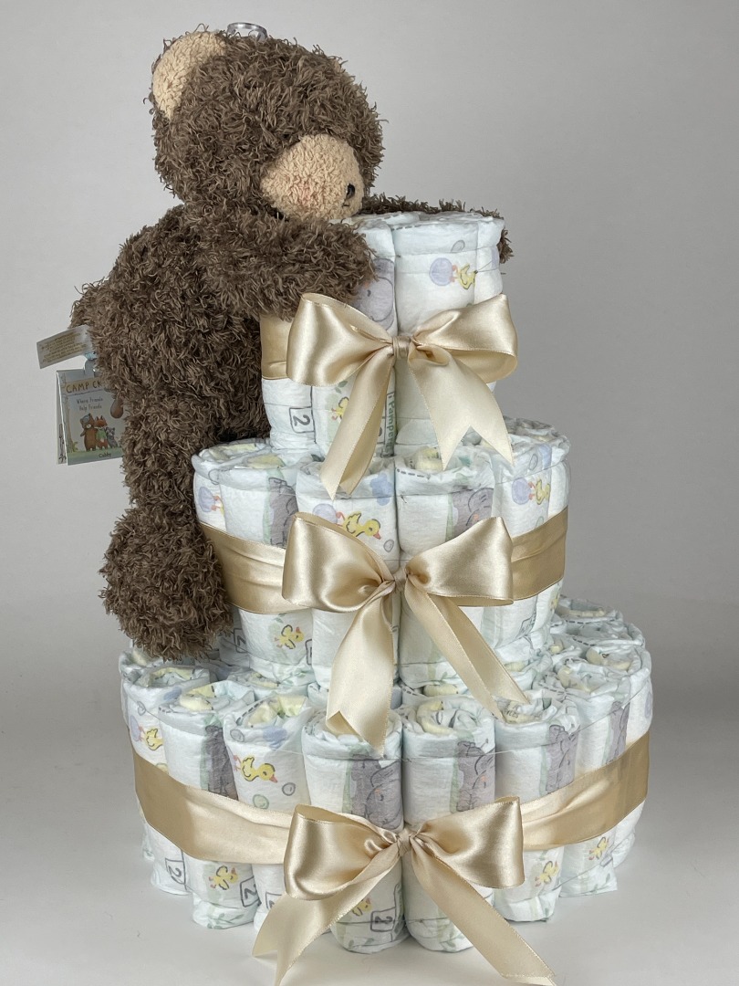 Luiertaart Bunnies By The Bay Beer Cubby Beige. Een mooie luiertaart opgebouwd met drie lagen luiers maat 2 van het merk Pampers, met eromheen mooie neutrale beige gekleurde linten en ter aankleding van de luiertaart een super lief knuffelvriendje van het merk Bunnies By The Bay.