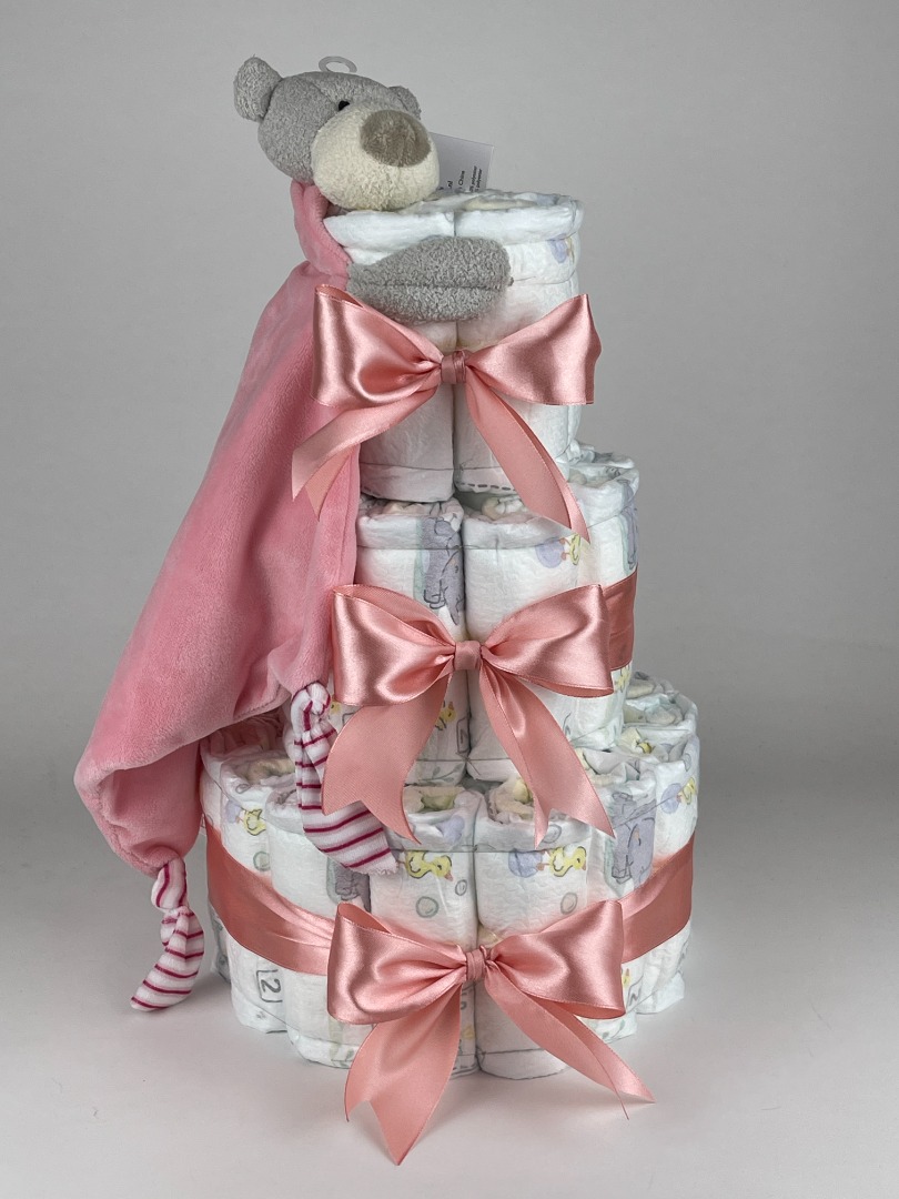 Luiertaart Knuffeldoek Beer Roze - donker Poeder Roze. Een mooie luiertaart opgebouwd met drie lagen luiers maat 2 van het merk Pampers met eromheen mooie donker poeder roze gekleurde linten en ter aankleding van de luiertaart een super zacht groen gekleurd knuffeldoekje met een grijs/bruin gekleurd berenhoofdje en kleine berenpootjes.