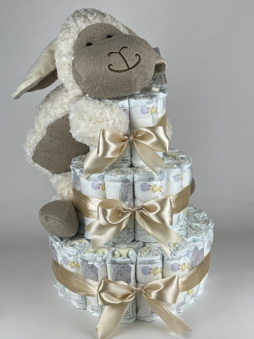 Luiertaart Zippies Schaap Beige. Een mooie luiertaart opgebouwd met drie lagen luiers maat 2 van het merk Pampers met eromheen mooie neutrale beige gekleurde linten en ter aankleding van de luiertaart een ecru/beige gekleurd knuffel Schaap.
