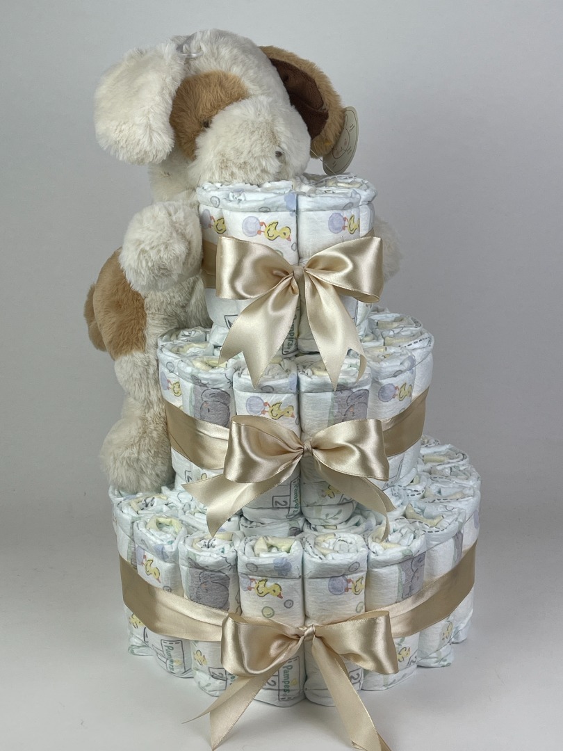 Luiertaart Bunnies By The Bay Hond Beige. Een mooie luiertaart opgebouwd met drie lagen luiers maat 2 van het merk Pampers, met eromheen mooie neutrale beige gekleurde linten en ter aankleding van de luiertaart een super lief knuffelvriendje van het merk Bunnies By The Bay.