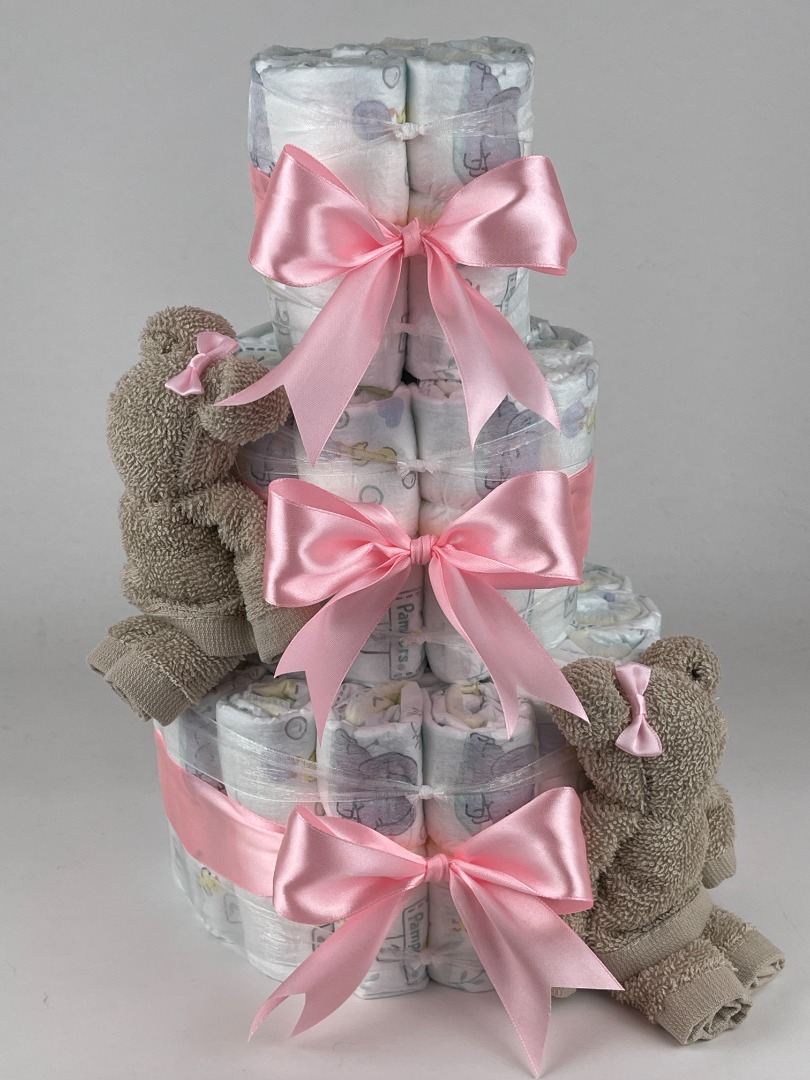 Luiertaart Beren Cream - Roze. Een mooie luiertaart opgebouwd met drie lagen luiers maat 2 van het merk Pampers, met eromheen mooie roze gekleurde linten en ter aankleding van de luiertaart twee cream beige gekleurde monddoekjes | spuugdoekjes gevouwen als beren.
