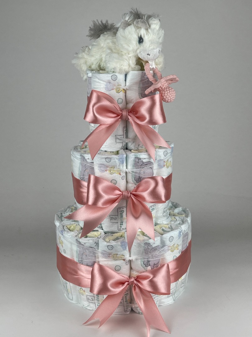 Luiertaart RaZbuddy Speenknuffel Eenhoorn donker Poeder Roze. Een mooie luiertaart opgebouwd met drie lagen luiers maat 2 van het merk Pampers, met eromheen mooie donker poeder roze gekleurde linten en ter aankleding van de luiertaart een schattig klein RaZbuddy knuffeltje eenhoorn met een roze silicone RaZberry bijtspeentje van het merk Razbaby.