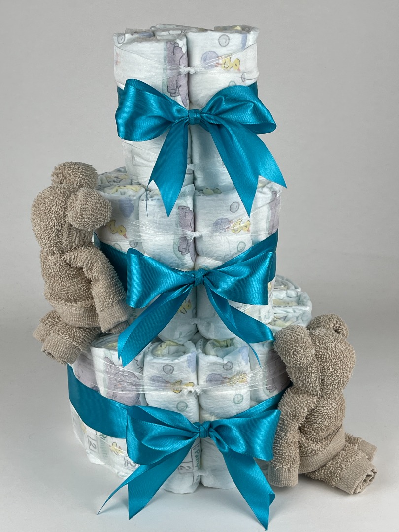 Luiertaart Beren Cream - Petrol. Een mooie luiertaart opgebouwd met drie lagen luiers maat 2 van het merk Pampers, met eromheen mooie petrol groen / blauw gekleurde linten en ter aankleding van de luiertaart twee cream beige gekleurde monddoekjes | monddoekjes gevouwen als beren.