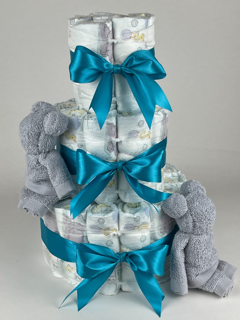 Luiertaart Beren Grijs - Petrol. Een mooie luiertaart opgebouwd met drie lagen luiers maat 2 van het merk Pampers, met eromheen mooie petrol groen / blauw gekleurde linten en ter aankleding van de luiertaart twee grijs gekleurde monddoekjes | monddoekjes gevouwen als beren.