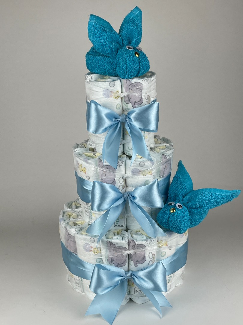 Luiertaart Konijnen Aqua blauw - Blauw. Een mooie luiertaart opgebouwd met drie lagen luiers maat 2 van het merk Pampers, met eromheen mooie blauw gekleurde linten en ter aankleding van de luiertaart twee aqua blauw gekleurde monddoekjes | spuugdoekjes gevouwen als konijnen.