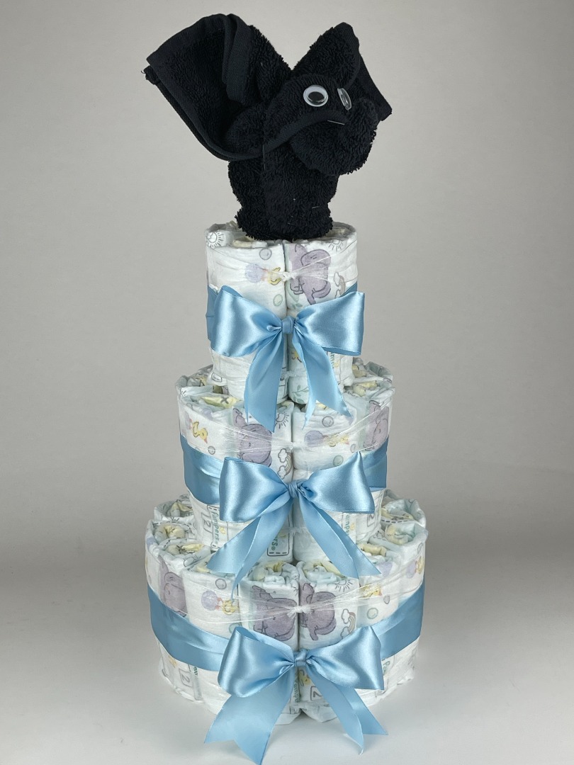 Luiertaart Olifant Zwart - Blauw. Een mooie luiertaart opgebouwd met drie lagen luiers maat 2 van het merk Pampers, met eromheen mooie blauw gekleurde linten en ter aankleding van de luiertaart staat bovenop de taart een olifant gevouwen van twee zwart gekleurde monddoekjes | spuugdoekjes.