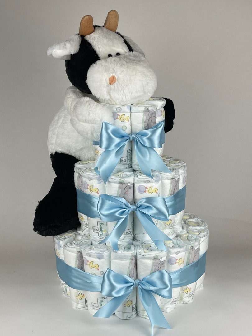 Luiertaart Koe Blauw. Een mooie luiertaart opgebouwd met drie lagen luiers maat 2 van het merk Pampers met eromheen mooie blauw gekleurde linten en ter aankleding van de luiertaart een lieve zachte knuffel koe.