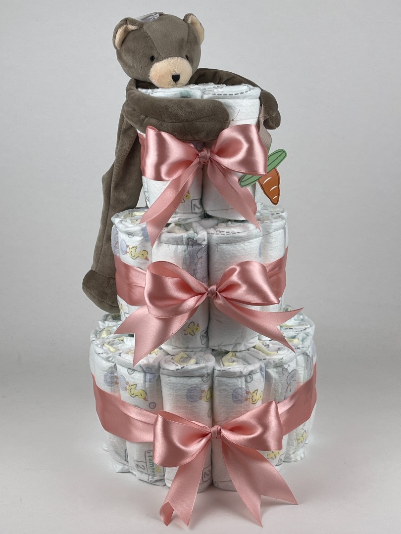 Luiertaart Bunnies By The Bay Speenknuffel Beer Cubby donker Poeder Roze. Een mooie luiertaart opgebouwd met drie lagen luiers maat 2 van het merk Pampers, met eromheen mooie donker poeder roze gekleurde linten en ter aankleding van de luiertaart een zacht bruin gekleurd knuffeltje met speenkoord van het merk Bunnies By The Bay.