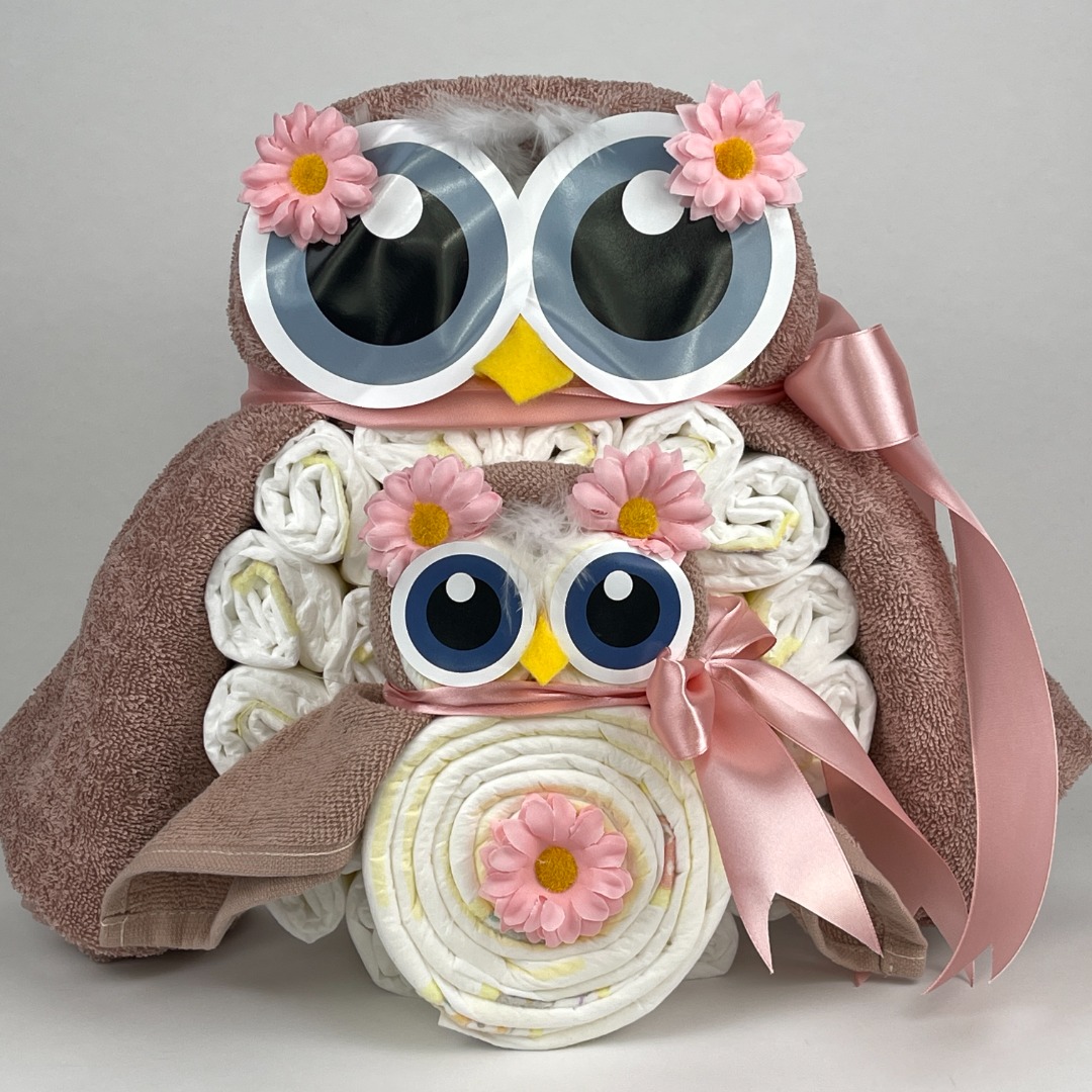 Luieruil Pinkstone roze. Een vrolijke set luieruilen met een grote en kleine uil in mooie pinkstone roze gekleurde tinten gemaakt van luiers maat 2 van het merk Pampers, een pinkstone roze gekleurd monddoekje | spuugdoekje en een pinkstone roze gekleurde bad handdoek.